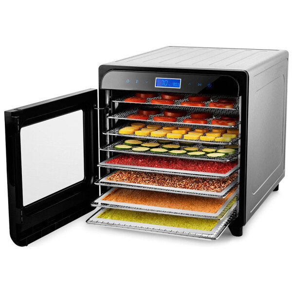На сушилке можно устанавливать температуру сушки в диапазоне 35-75C с шагом 5 градусов. Сушилка также оснащена таймером до 24 часов с шагом 1 час. Для вашего удобства необходимые время и температуру сушки различных продуктов мы указали в инструкции.