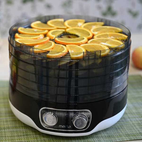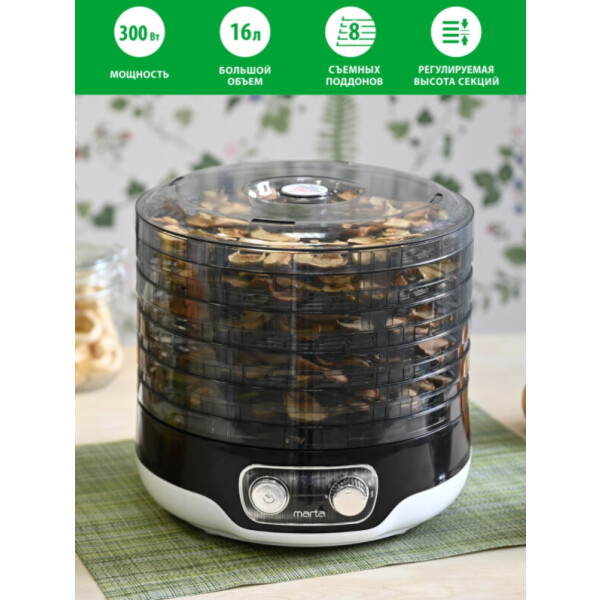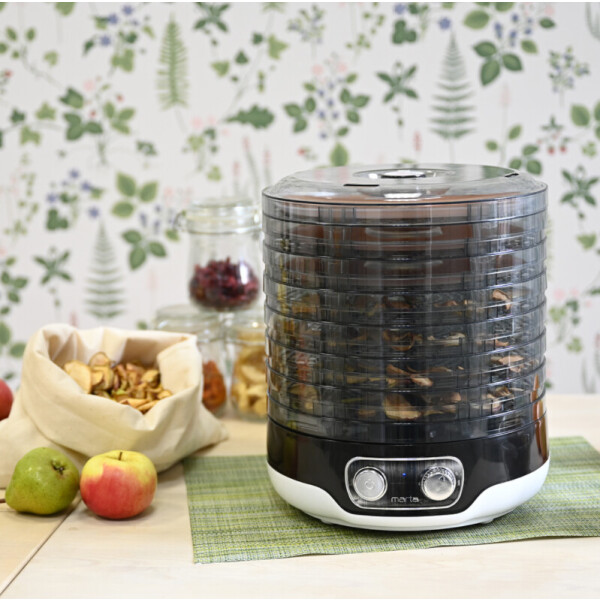 Сушилка для овощей Marta MFD-208PS цвета темный обсидиан обеспечит равномерную сушку трав, зелени, овощей, фруктов, орехов, грибов, приготовления вяленого мяса, птицы, рыбы. А также поможет приготовить кисломолочные продукты и расстойку теста.