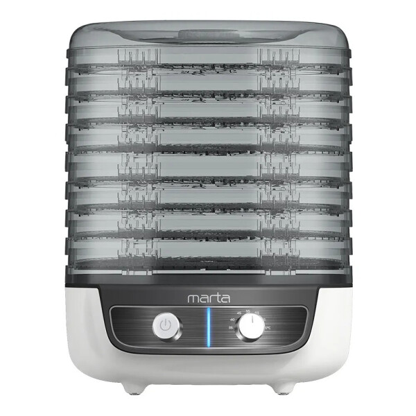 Сушилка для фруктов, овощей MARTA MFD-8018PS имеет 8 регулируемых по высоте поддонов, 3 из которых разборные. Подходит для сушки овощей, фруктов, трав, орехов, приготовления вяленого мяса и рыбы, йогурта, расстойки теста.