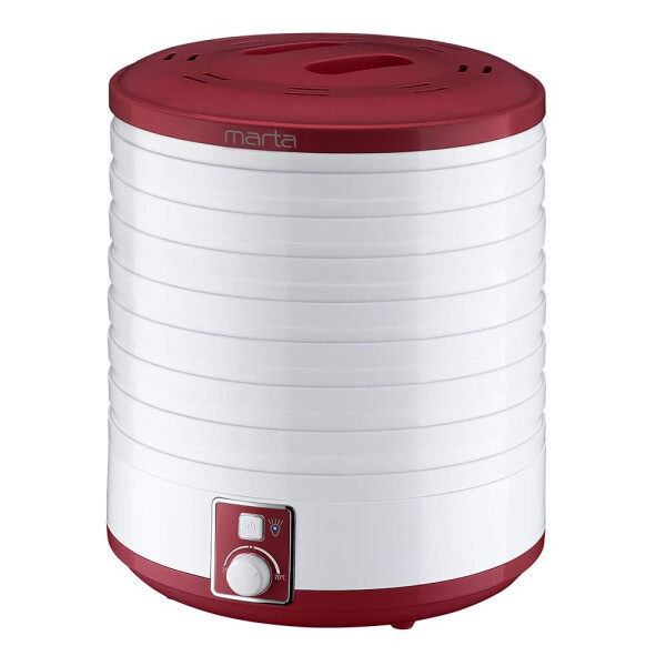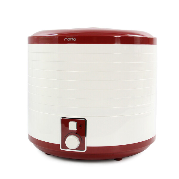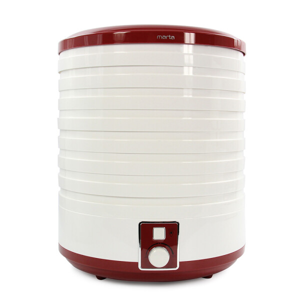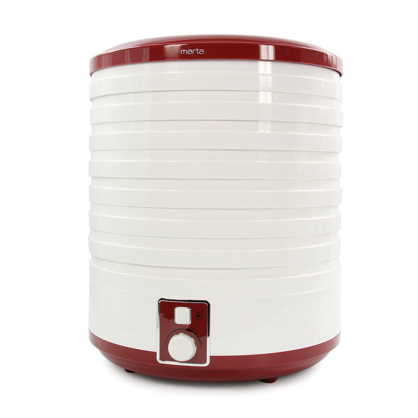 Электросушилка Marta MT-1881 станет полезной помощницей тем, кто делает сезонные заготовки значительными объёмами. Эта модель оборудована 11 поддонами диаметром 31 см, что позволит одновременно закладывать продукты разных типов. Кроме дегидрирования фруктов, овощей, ягод и зелени, прибор подойдёт для вяления мяса и рыбы, приготовления йогурта, ряженки, сметаны, расстойки теста.