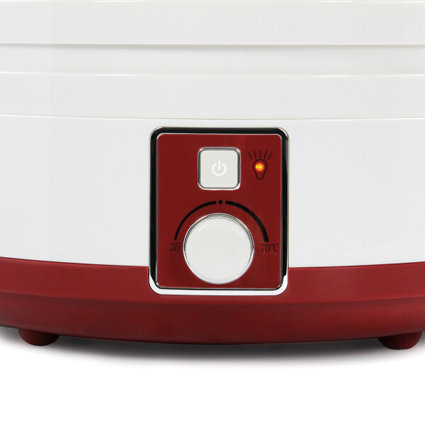 Механическое управление простое в использовании и надёжное. За включение и выключение отвечает одна кнопка, световой индикатор показывает, что есть подключение к сети. Температура регулируется с помощью поворотного переключателя в диапазоне от 35 до 70. Уровень шума при вращении вентилятора не превышает 40 дБ, что сравнимо с работой современного холодильника сушилку можно запускать даже на ночь, она не помешает отдыху.