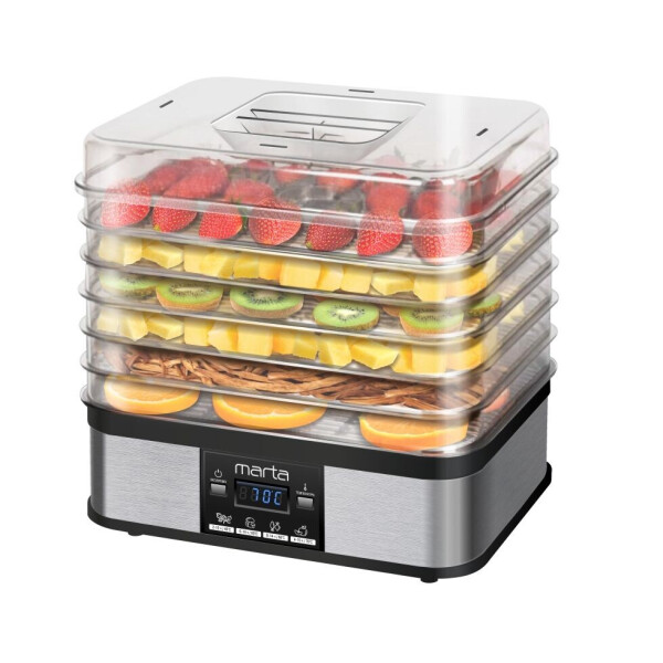 Шестиуровневая электросушилка c электронным контролем температуры Marta MT-1885. Поддоны сушилки изготовлены из пищевого термостойкого пластика. Встроенный вентилятор равномерно нагнетает воздух в пространство сушилки, обеспечивая необходимые условия для эффективного сохранения полезных микроэлементов