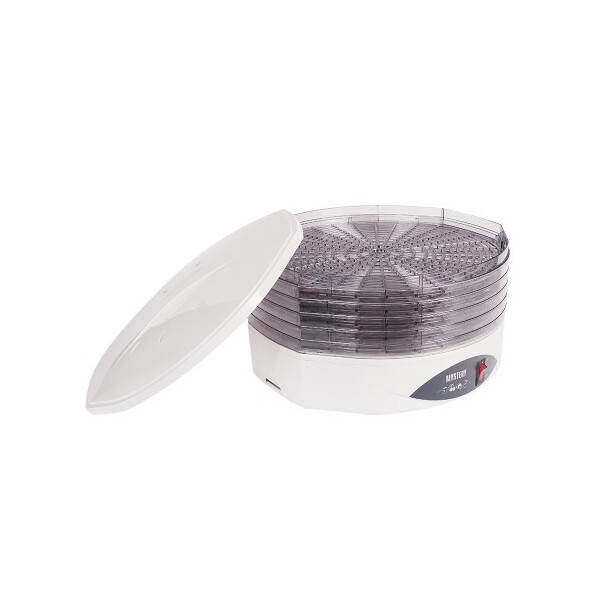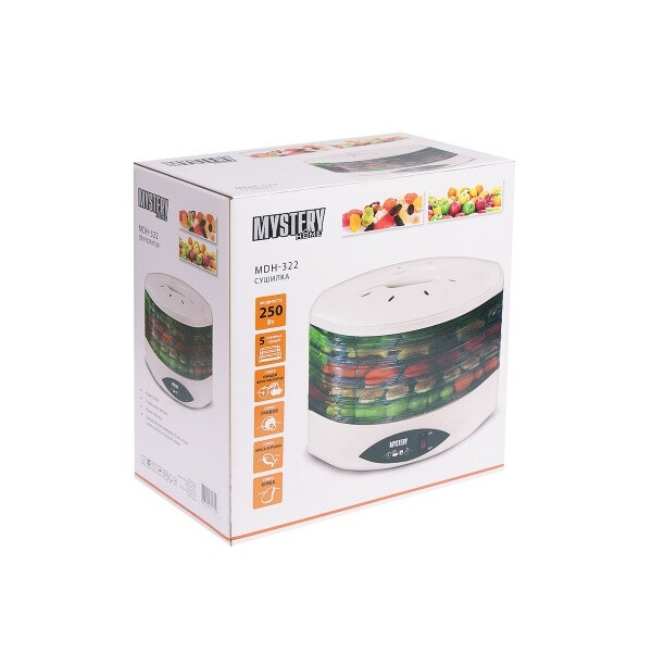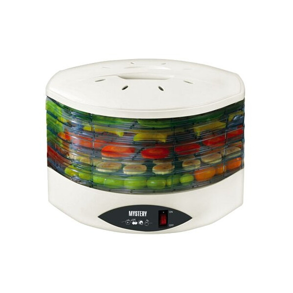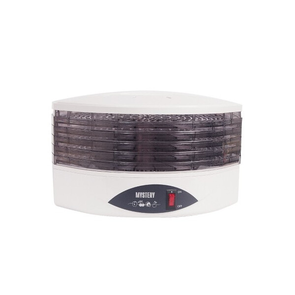 Сушилка для овощей и фруктов Mystery MDH-322 с мощностью 250 Вт отличается простым устройством и эффективностью работы. В нижней части корпуса встроен источник подачи теплого воздуха. Прибор вмещает пять секций для продуктов общей вместительностью 4.8 кг. Время высушивания колеблется от 2 до 24 часов, это зависит от выбранных продуктов. Данная модель хорошо подходит для обработки фруктов, овощей, ягод и трав, грибов, вяления мяса, рыбы, сохраняя при этом все их полезные качества.