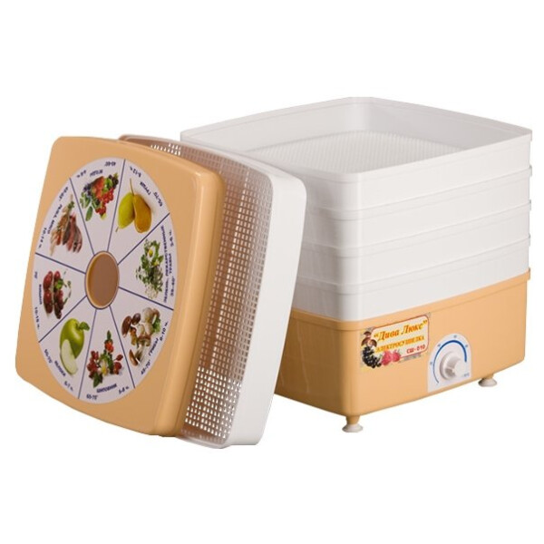Электрическая сушилка «Дива-Люкс»создана для высушивания овощей, фруктов, грибов, ягод, трав, мяса, рыбы и других продуктов в домашних условиях. Надежная, компактная и простая в эксплуатации сушилка поможет сохранить для зимы продукты, которые не поместились в морозильную камеру, а также приготовить домашнюю лапшу, сухарики или вяленую рыбу. Электрическая сушилка «Дива-Люкс»создана для высушивания овощей, фруктов, грибов, ягод, трав, мяса, рыбы и др. в домашних условиях. Высушивание происходит за счет обдувания продуктов потоком горячего воздуха, одновременно с высушиванием происходит уничтожение микроорганизмов, вызывающих порчу продуктов. Внутри корпуса сушилки находятся пластиковые лотки с небольшими отверстиями, под которыми расположен вентилятор и трубчатый нагреватель (тэн). Поток горячего воздуха обдувает продукты, расположенные на лотках и удаляется из сушилки с помощью вентилятора. Тепловое излучение, которое выделяется с помощью тэнов в сушилке, поглощается водой, а не продуктами. Высушивание происходит при невысоких температурах — от 3 до 70 градусов, а продукт сохраняет витамины практически полностью. Отверстия в лотках небольшого размера, что позволяет высушивать мелкие ягоды. Время сушки колеблется от 2 до 22 часов, в зависимости от продукта; эффективность — около 80%. Несмотря на компактный размер, сушилка с комплектом 5 сит достаточно вместительная — ее объем составляет 17 литров. Продукты, высушенные в сушилке, сохраняют свои вкусовые качества и не пересушиваются, в отличие от высушенных в духовке; а по сравнению с высушиванием на солнце процесс занимает гораздо меньше времени. Бытовая сушилка — альтернатива морозильной камере, объем которой не всегда достаточен. Надежная, компактная и простая в эксплуатации сушилка станет незаменимым помощником на кухне, поможет сохранить для зимы грибы, ягоды, лекарственные травы, а также приготовить домашнюю лапшу, сухарики или вяленую рыбу. Высушенные продукты долго хранятся и могут быть использованы при изготовлении киселей, компотов, супов и других блюд.