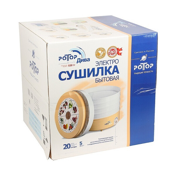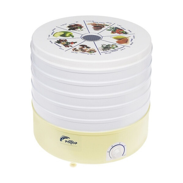 Электрическая сушка РОТОР Дива СШ 007 удачно сочетает в себе такие важные для многих хозяек достоинства, как невысокая цена, большая вместительность сушильной камеры и простота в управлении. Эта модель благодаря 5 глубоким поддонам и наличию вентилятора позволит одновременно заготавливать до ведра переработанных овощей или фруктов. Также на разных ярусах можно одновременно сушить разные продукты. Сушка РОТОР Дива СШ 007 имеет возможность плавного выбора температуры от 30 до 70 градусов. Это позволит быстро заготовить на зиму сочные яблоки, подсушить лекарственные травы или зелень. Также технику можно использовать для приготовления домашнего вяленого мяса или рыбы, различной домашней лапши. Поддоны очень просто моются и изготовлены из прочного пищевого пластика. Небольшая памятка-инструкция напечатана прямо на верхней крышке сушильной камеры.