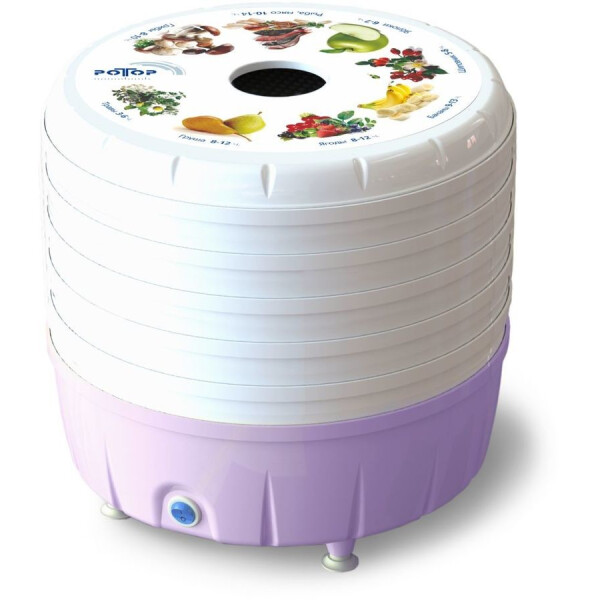 Сушилка для овощей и фруктов Ротор-Люкс СШ-023 в белом пластиковом корпусе состоит из 5 секций, максимальная нагрузка на каждую из которых может достигать 1 кг. Нагревательный ТЭН с мощностью 350 Вт с вертикальной подачей воздуха эффективно и равномерно просушивает овощи, фрукты и ягоды. Внутри сушилки для овощей и фруктов Ротор-Люкс СШ-023 температура может достигать 75. В конструкции модели предусмотрены небольшие ножки для установки. За счет того, что кнопка только одна, разобраться с его управлением очень просто.