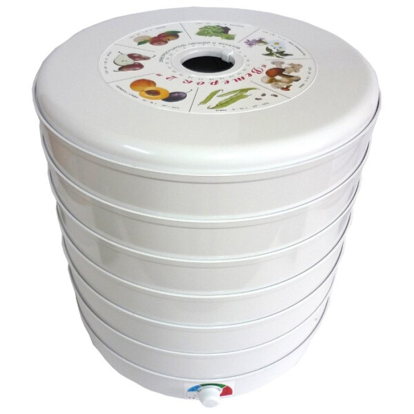 Электросушитель для овощей и фруктов с шестью поддонами Ветерок-2 ЭСОФ 2-0,6/220 имеет большую емкость и хорошую производительность. Он предназначен для сушки плодов (яблоки, груши, вишни и т.д.), ягод, овощей, грибов, лекарственных растений. Эффективность сушки составляет не менее 80% от массы исходного продукта при температуре от 30 до 70°С и времени от 2 до 30 часов. В данном приборе также установлен вентилятор повышенной мощности.