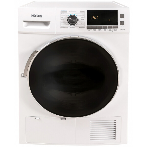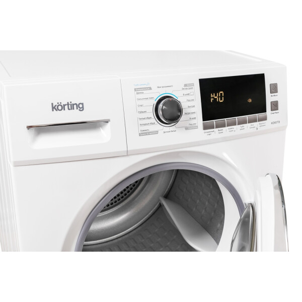 Сушильная машина Korting KD 60T8 оснащена функцией Отложенный старт. В некоторых случаях необходимо отложить включение прибора на несколько часов, чтобы, например, сэкономить на тарифах электроэнергии или завершить процесс к определенному времени. Отложенный старт позволяет запрограммировать прибор на автоматическое включение в нужное время. Чтобы любимое чадо не вмешивалось в процесс работы программы, есть возможность блокировки управления. При этой функции недоступны для нажатия любые кнопки кроме выключения машины. Не всегда получается достать бельё сразу после сушки из-за различных забот. Чтобы высушенное белье не сминалось в сушильном барабане, включите функцию защиты от сминания, и машина будет периодически разрыхлять белье до тех пор, пока Вы его не заберете.