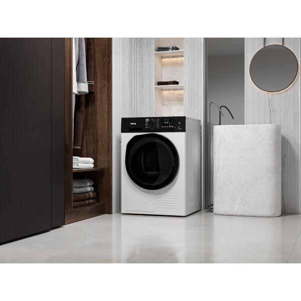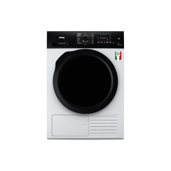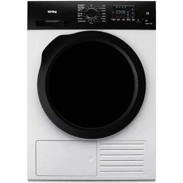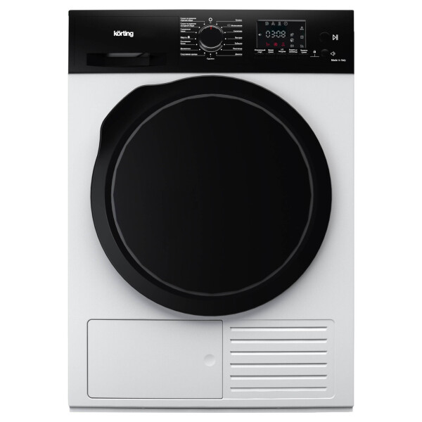 Сушильная машина Korting KD 69 IHP с технологией сушки Heat Pump - это когда внутри прибора компактно размещаются два важных элемента горячий и холодный контуры. Задача горячего контура нагреть воздух, который далее, при помощи вентилятора, попадает в барабан и забирает влагу из мокрых тканей. Второй активный холодный контур эту влагу собирает и отправляет в съемный резервуар. Такая технология позволяет меньше нагревать воздух, что помогает сушить вещи деликатнее и существенно снижать потребление электроэнергии.