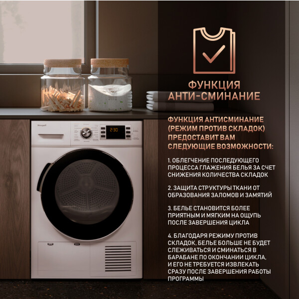 Отдельностоящая сушильная машина Weissgauff, оснащенная современным двигателем, имеет великолепный показатель загрузки до 8 килограммов белья, вместительный объем барабана 109 л и полностью электронное управление, что в сочетании с современной конденсационной системой сушки станет для вас гарантией непревзойденной эффективности и высокого результата при каждом запуске этой великолепной модели! Внутренняя подсветка позволит без труда увидеть всё внутреннее пространство камеры сушильной машины, что облегчит как загрузку/выгрузку белья, так и уход за вашим бытовым прибором! Кабель длиной 1,5 м открывает широкие возможности по установке устройства относительно электрических розеток!