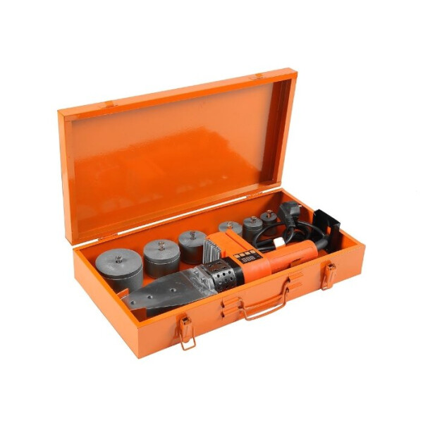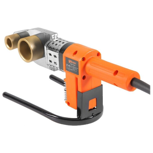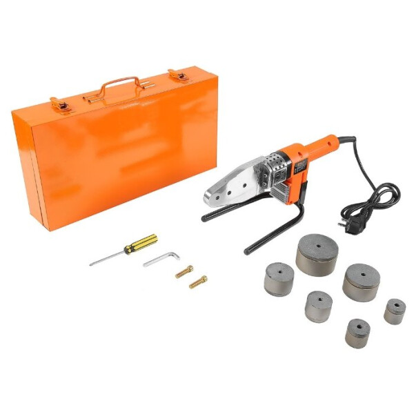 DWM 1000A — аппарат для сварки полипропиленовых труб с насадками в комплекте. Инструмент применяется при монтаже трубопроводных систем различного назначения. Подходит для сварки труб разного диаметра — 20, 25, 32, 40, 50, 63 мм. Отличается наличием индикатора работы и возможностью регулировки температуры (от 0 до 300 °C). Мощность — 1000 Вт.