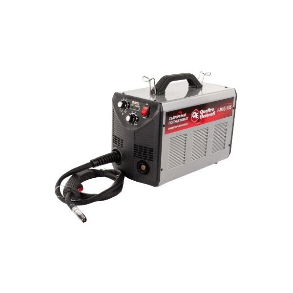 Инверторный аппарат полуавтоматической сварки QUATTRO ELEMENTI QE Ergus i-MIG 135 770-049 - это однофазное устройство, которое используют для проведения сварочных работ в частных мастерских, гараже и др. Сварка производится плавящейся проволокой на постоянном токе в разных направлениях: правосторонняя (выпуклый валик, нет образования шлака внутри валика, используется в основном при сварке стали) и левосторонняя (когда сильное проваривание не требуется, используется для тонколистового металла, для алюминия). Напряжение питания от 185 до 240 В.