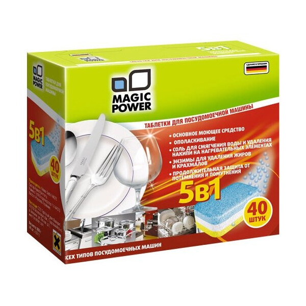 Средство для мытья посуды Magic Power MP-2023 поставляется в контейнере из плотного картона, имеет прорези для легкого вскрытия, внутри пользователь увидит 40 таблеток. Основное моющее средство связывает и выводит с поверхности посуды частички грязи. Ополаскиватель производит дезинфекцию и устраняет неприятные запахи.