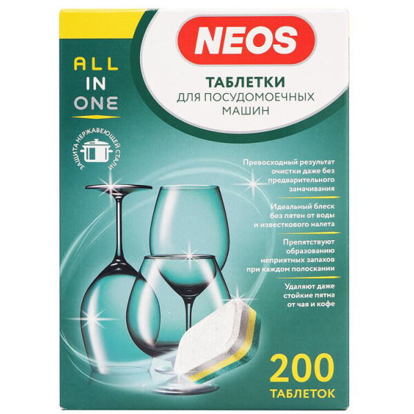 Таблетки Neos All in One поставляются в коробке и предусматривают возможность выполнения 200 циклов мытья.