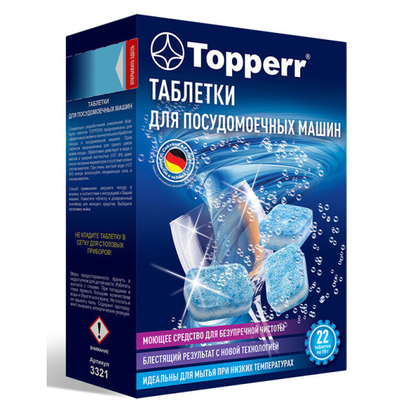 Специально разработанная уникальная формула таблеток TOPPERR 3321 предназначена для эффективной мойки и окончательной обработки посуды в посудомоечной машине.