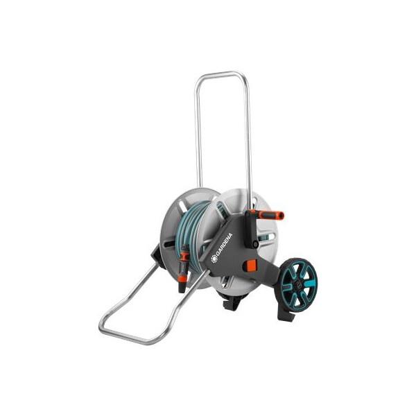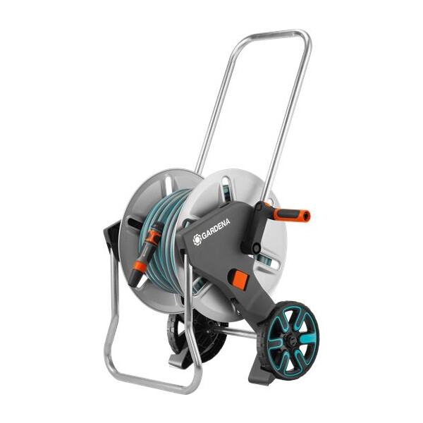 Металлическая тележка для шлангов GARDENA AquaRoll M 18542-20.000.00 удобна в использовании: она не перевернется, даже если сильно тянуть за шланг. Шланг легко сворачивается с помощью эргономичной пластиковой рукоятки с мягкими пластиковыми вставками. Угловое соединение на внутренней стороне катушки предотвращает перегиб шланга - для стабильного потока воды. Защита от протечек предотвращает вытекание воды после использования инструментом.