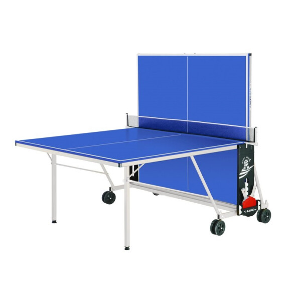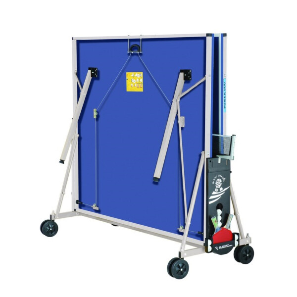 Надежная крепкая рама из стального профиля 30 х 30 мм, с двойной порошковой покраской белого цвета и полимерным антикоррозийным покрытием. Стол оборудован четырьмя сдвоенными маневровыми колесами диаметром 125 мм, компенсаторами неровности пола на ножках, а также боксом для хранения двух ракеток и восьми мячиков.