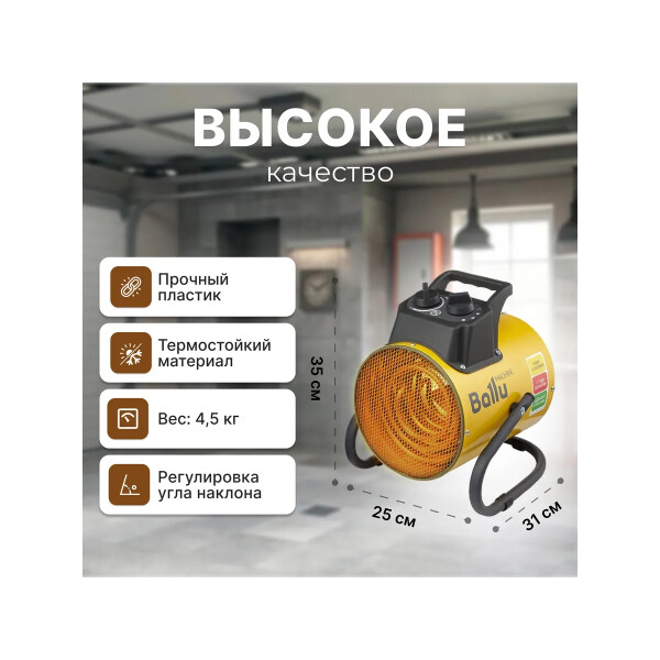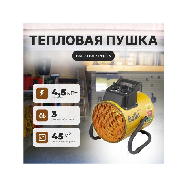 Тепловая пушка электрическая Ballu BHP-PE-5 мощностью 4,5 кВт предназначена для строящихся, ремонтируемых объектов и помещений площадью до 50 м Идеально подходит для направленного обогрева и просушки поверхностей в ангарах, складах, базах, гаражах, производственных мастерских. Благодаря резиновым насадкам на ножках не царапает поверхность. Имеет два режима мощности и режим вентиляции без нагрева. Тепловые пушки Ballu серии PE это компактные и легкие тепловые пушки направленного нагрева в круглом корпусе. Пушка выполнена в корпусе из нержавеющей стали, с возможностью регулирования угла наклона. В качестве нагревательного элемента используется ТЭН из нержавеющей стали. Корпус специально обработан для предотвращения коррозии. Тепловые пушки имеют режимы защиты от перегрева и от поражения электрическим током.