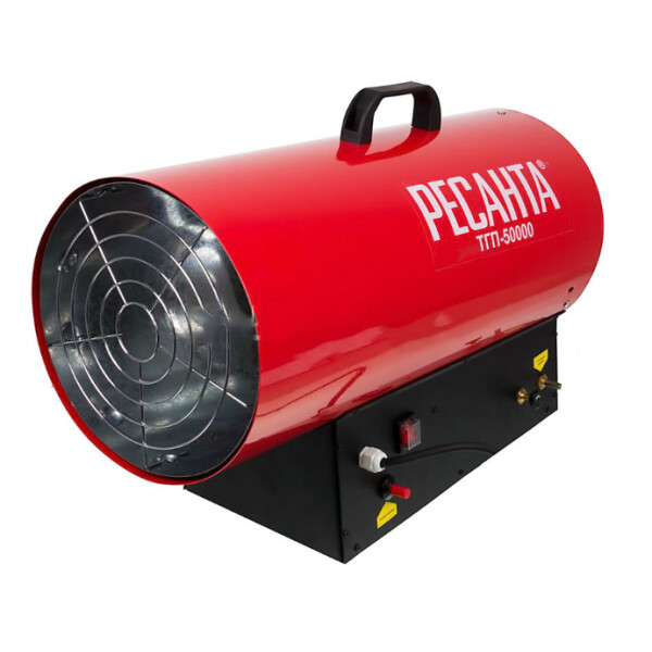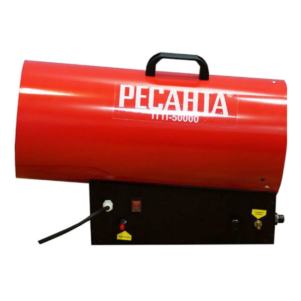 Газовая тепловая пушка РЕСАНТА ТГП-50000 – воздухонагреватель, работающий на сжиженном газовом топливе. Топливо необходимо для получения горячей атмосферы в камере сгорания, а электроэнергия, подводимая к устройству, необходима для питания вентилятора, нагнетающего воздух, и для функционирования автоматики. Газовые пушки прямого нагрева являются простой и надёжной конструкцией без дымохода, где горячий воздух из устройства поступают в помещение.