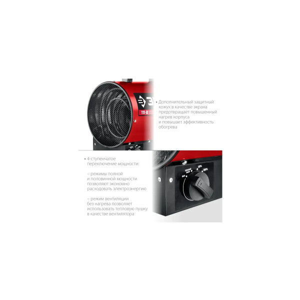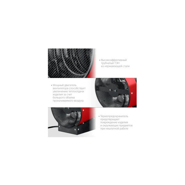 Большая площадь ТЭНов и эффективный обдув способствуют более быстрому нагреву помещения. Конструктивные меры безопасности: дополнительный защитный кожух, термопредохранитель, заземление корпуса, защищают изделие при нештатных ситуациях.