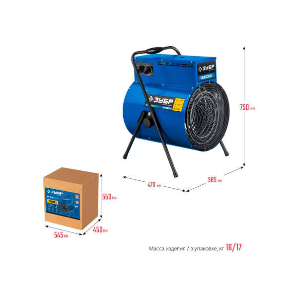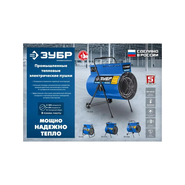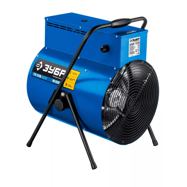 Электрическая тепловая пушка ЗУБР, 15 кВт, Профессионал, ТП-П15. Профессиональные электрические тепловые пушки с питанием от трехфазной электрической сети эффективны для быстрого и направленного обогрева складских и производственных помещений, ангаров и мастерских, благодаря большой площади нагревательных элементов и мощным двигателем вентилятора.