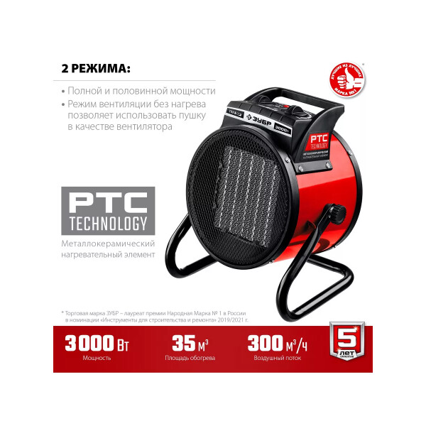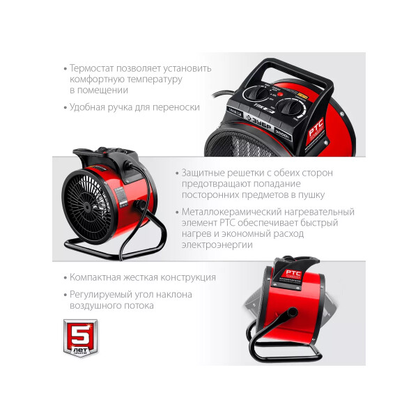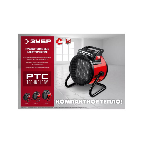 Электрическая тепловая пушка ЗУБР ТПК-3Р, предназначена для эффективного обогрева небольших помещений (квартира, вагончик, рабочее помещение). Электрические тепловые пушки ЗУБР серии ТПК –Р - компактные пушки в круглом корпусе. Благодаря небольшим размерам тепловую пушку легко переносить и хранить. Устройства оснащены долговечным металлокерамическим нагревательным элементом, обеспечивающим быстрый равномерный нагрев, экономное потребление электроэнергии и при этом не сушит воздух в помещении. Механический терморегулятор поддерживает нужную температуру нагрева. За счет большой площади теплообмена и небольшой температуры нагрева элемента, воздух быстро прогревается. Небольшой размер и вес позволяет легко переносить тепловую пушку из одного помещения в другое.Тепловая электрическая пушка-гарантия 5 лет.
