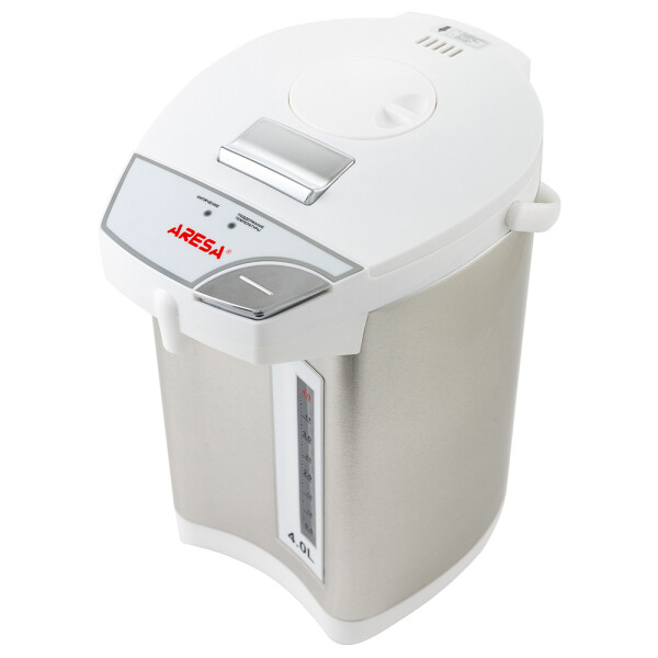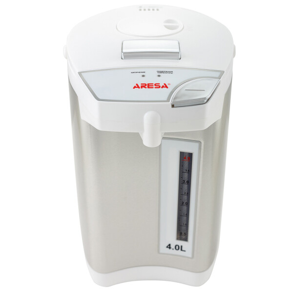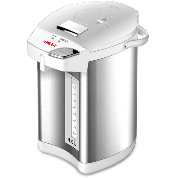 Термопот Aresa AR-4002 объемом 4 л представляет собой устройство, которое сочетает в себе функции электрического чайника и термоса. Во включенном состоянии он способен постоянно поддерживать находящуюся внутри жидкость горячей. Когда прибор выключен, он сохраняет температуру воды на протяжении 4 часов.