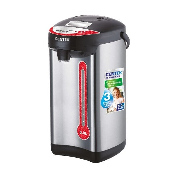 Термопот Centek CT-0082 выполнен в черном корпусе с серебристым основанием, а материалами для него послужили металл и пластик: крышка и ручка из пластика способствуют бережному пользованию устройством. Функциональность прибора делает его лучшим приспособлением для использования как дома, так и в офисе. Обладая объемом 5 литров, термопот позволит удовлетворить потребности всей семьи или небольшого коллектива. Термопот сочетает в себе функционал двух устройств – термоса и чайника. То есть, он способен закипятить воды с последующим поддержанием температуры.