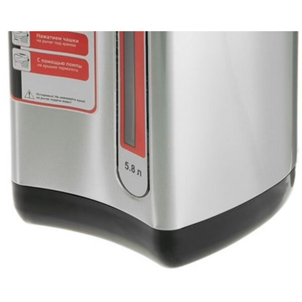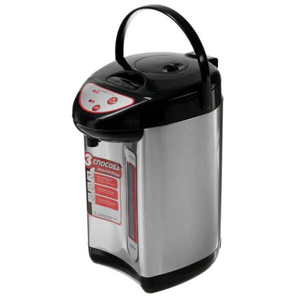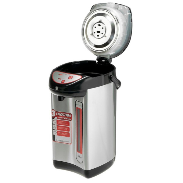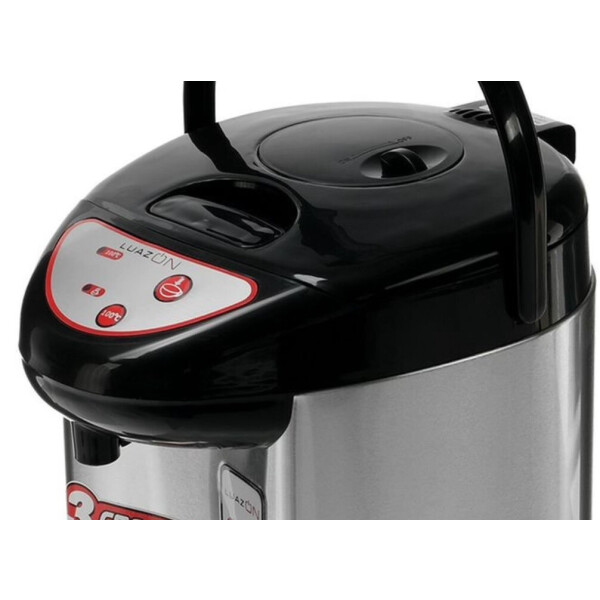 Термопот LUAZON LET-5001 на 5,8 л это современный электрический водонагреватель с возможностью поддержания температуры. Данная конфигурация произведена из высококачественной нержавеющей стали. Благодаря двойным стенкам корпус не нагревается и защищает пользователя от ожогов. Удобство в использовании этой модели обеспечивают три разных вида подачи воды с помощью ручной или электропомпы, а также при нажатии кружкой на клапан. Прибор оснащен функцией автоматического кипячения и повторного кипячения, а также защитой от случайного нажатия. Комфортное перемещение изделия легко производить с помощью надежной ручки в верхней части прибора.