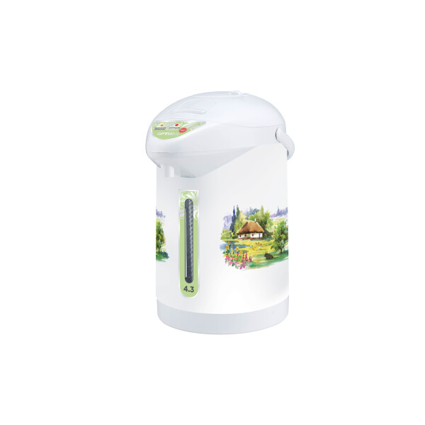 Поттер OPTIMA AP-433R - устройство, совмещающее в себе функции термоса и чайника. Позволяет кипятить воду и поддерживать ее горячей в течение длительного времени. Таким образом вы экономите не только время, но и электроэнергию. Поттер имеет объем 4,3 литра, оснащен индикаторами уровня воды и нагрева, функцией поддержания температуры и защиты от перегрева. Чайник-термос снабжён пластиковой ручкой для удобства переноса. На верхней части поттера расположена и панель управления. Кнопка ПОДАЧА ВОДЫ включает электронасос и подаёт воду в чашку. На панели управления расположены два световых индикатора. Индикатор поддержание температуры сигнализирует о готовности чайника-термоса к работе, индикатор кипячение показывает процесс нагрева воды. Предусмотрено три способа налива воды: воздушная помпа (ручная), электронасос (кнопка), налив с помощью посуды.