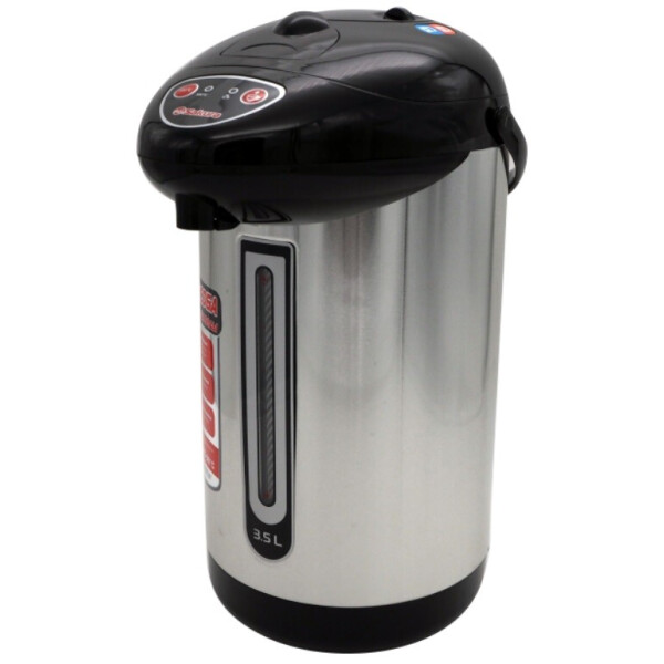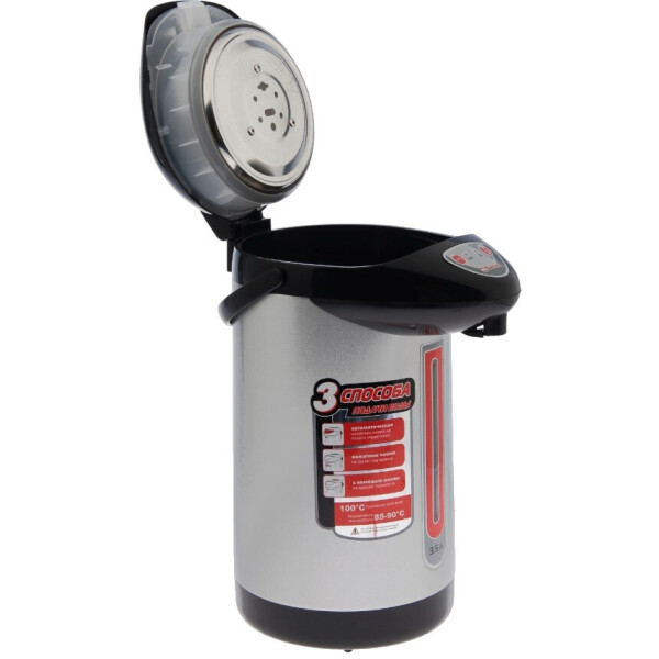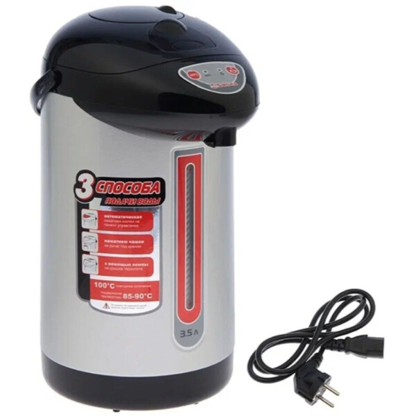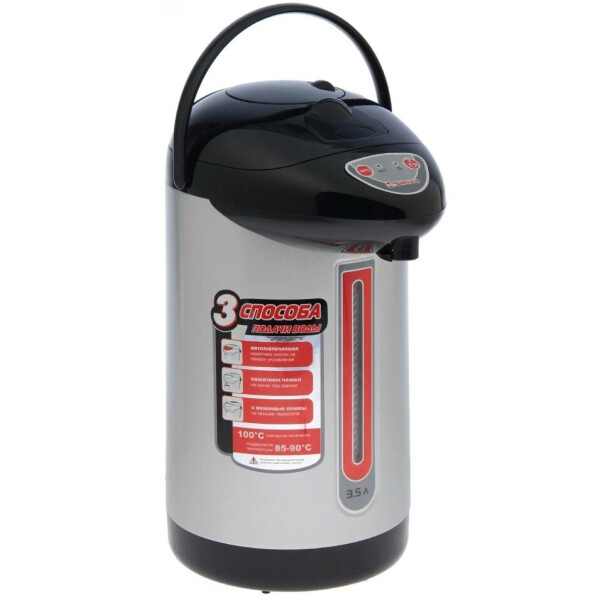 Чайник-термос с функцией кипячения и поддержания температуры на уровне 85-90С. Двойная защита от перегрева и включения без воды. Три способа подачи воды. Поворот основания на 360. Световые индикаторы режима работы. Основные характеристики: Объем: 3,5 л. Мощность: 750 Вт. Тип управления: кнопочный. Повторное кипячение: есть. Поддержание температуры воды: 85-90С. Температурные режимы: нет. Способ подачи воды: автоматический кнопкой, нажатием чашки, помпой. Автоматическая очистка: нет. Отсрочка запуска: нет. Режим ожидания: нет. Блокировка кнопкой на панели: нет. Подсветка при включении: нет. ЖК дисплей: нет. Материал колбы: нержавеющая сталь. Материал корпуса: металл.