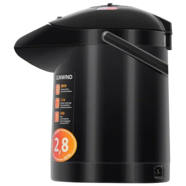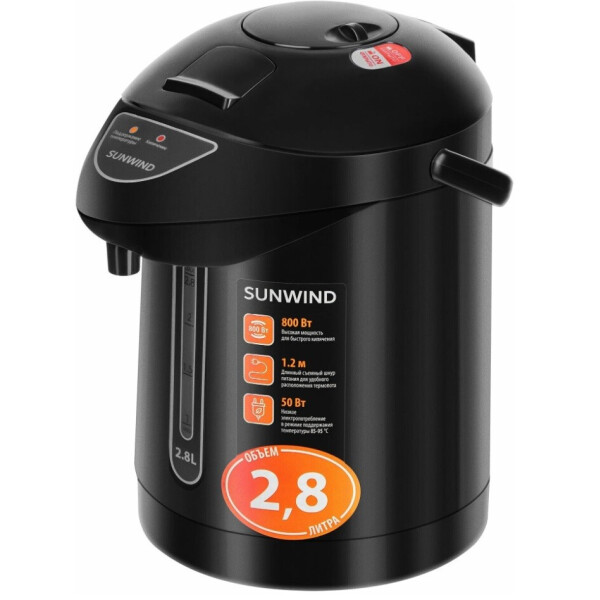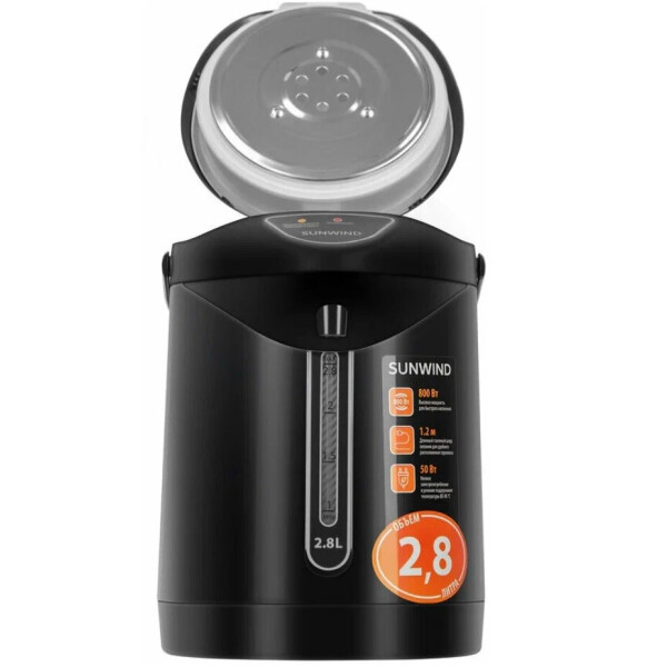 Термопот SunWind SUN-TP-1 устройство, предназначенное для приготовления горячих напитков. Способен вскипятить и поддерживать постоянно высокую температуру воды. Совмещает в себе функции электрического чайника и термоса. Возможность выставлять температуру в диапазоне от 85 до 95 и 100С. Общий объем составляет 2,8 л, а полезный 2,5 л, чего достаточно для эксплуатации в домашних условиях. Предусмотрена опция повторного кипячения. Благодаря автоматическому отключению после закипания и защите от перегрева эксплуатация термопота максимально безопасная. Съемная крышка для удобного наполнения и обслуживания. Возможность блокировки подачи воды снизит вероятность получения ожогов. Прибор оборудован ручным насосом для безопасной подачи кипятка. Удобство эксплуатации обеспечивают шкала уровня жидкости и индикатор включения. Колба изготовлена из нержавеющей экологичной стали, которая не имеет запаха и сохраняет природные свойства воды. Модель имеет плоское дно со скрытым нагревательным элементом, устойчивым к образованию накипи. Это обеспечивает продолжительный срок службы. Показатель мощности устройства составляет 800 Вт при кипячении воды. В режиме поддержания температуры прибор потребляет в час всего 50 Вт, обеспечивая экономичный расход электроэнергии.