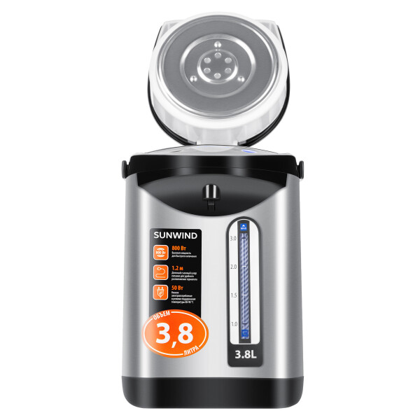 Термопот Sunwind SUN-TP-2 это вместительный чайник-термос с комбинированным типом насоса. Чаша прибора объемом 3,8 литра изготовлена из нержавеющей стали, нагревательный элемент скрытого типа. Термопот быстро доведет до кипения большой объем жидкости благодаря мощности 800 Вт. Пользователю доступно повторное кипячение и поддержание температуры воды в одном из двух температурных режимов. Также следует отметить высокий уровень безопасности прибора. Он защищен от перегрева и отключается автоматически. За работой устройства позволяют следить индикатор включения и индикатор уровня воды.