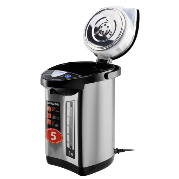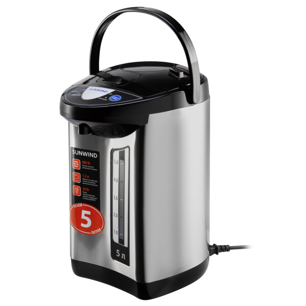 Термопот Sunwind SUN-TP-3 это прибор, предназначенный для кипячения и поддержания температуры воды, объемом до 5 литров. Производителем заявлена мощность 800 Вт, что позволяет термопоту быстро доводить до кипения жидкость. Доступно два температурных режима. Sunwind SUN-TP-3 оснащен нагревательным элементом скрытого типа и комбинированным насосом. Пользоваться им просто и безопасно. Прибор автоматически отключается и защищен от перегрева. Следить за уровнем воды удобно при помощи специального индикатора. Колба выполнена из нержавейки, крышка и подставка - из пластика.