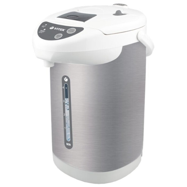 Термопот Vitek VT-1196 W – это отличное устройство, которое совмещает в себе опции чайника и термоса. Его объемный резервуар на 4 литра позволит вскипятить достаточно много воды и угостить чаем большую семью или компанию. Термопот подойдет для эксплуатации как дома, так и в офисе. Он особенно удобен тем, что после кипячения вода долго будет оставаться горячей. Наливать воду из данного устройства легко и просто – для этого достаточно лишь нажать на кнопку. Термопот не нужно наклонять или поднимать, ведь вода подается в кружку за счет удобного ручного или электрического насоса. Встроенный в термопот фильтр очистит воду от накипи и загрязнений. Для безопасности эксплуатации, Vitek VT-1196 W имеет защиту от перегрева, блокировку крышки и возможность выключения при закипании. Удобная индикация включения и уровня воды увеличивает комфорт от эксплуатации. Модель Vitek VT-1196 W имеет шкалу уровня воды, 3 режима ее подачи, а также звуковой сигнал, оповещающий о подогреве. Двойные стенки и колба из нержавеющей стали обеспечивают долговечность и надежность термопота.