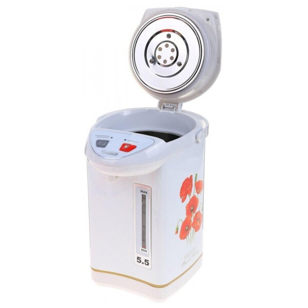 тип: термопот, материал корпуса: металл/пластик, объем: 5.50 л, тип нагревательного элемента: закрытая спираль, дополнительные функции: длительное кипячение, поддержание тепла, особенности: вращение на 360 градусов, двойные стенки, индикатор уровня воды, индикация включения, рисунок на корпусе, съемная крышка
