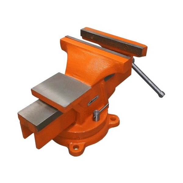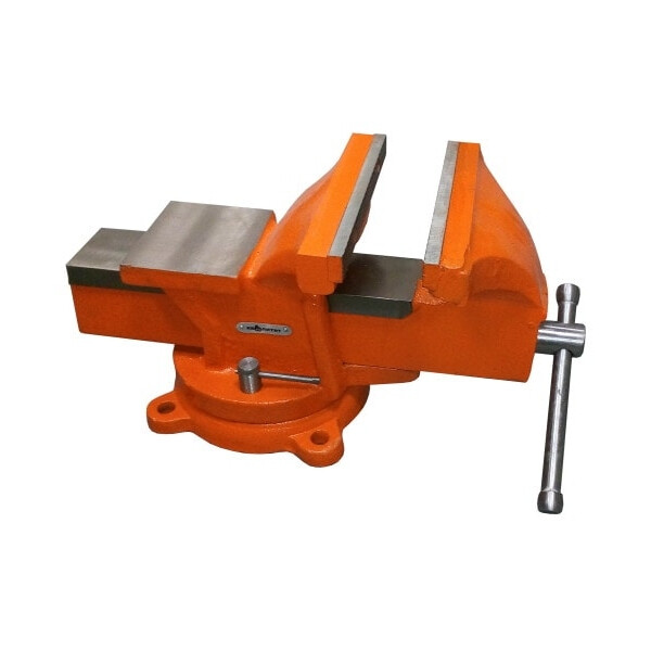 Тиски слесарные поворотные с наковальней, ширина губок 200 мм. Изготовлены из чугуна. Тиски предназначены для стационарной установки, поворотный механизм позволяет подобрать нужный угол установки детали для обработки. Не требуют специального обслуживания.