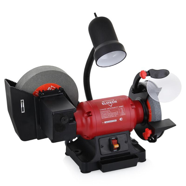 Точило ELITECH CT 300MC оснащено защитными экранами, предотвращающими попадания искр в глаза оператора, и регулируемой лампой освещения рабочей зоны. Станок имеет небольшой вес - 11.2 кг. и электродвигатель мощностью - 300 Вт. Предусмотрены металлические втулки для фиксации точильного круга.