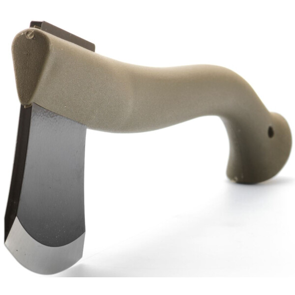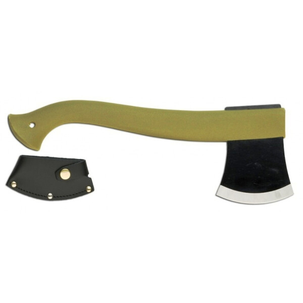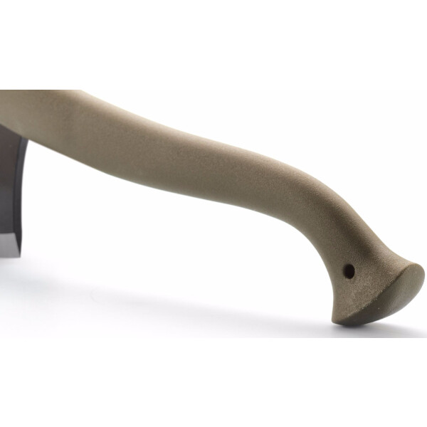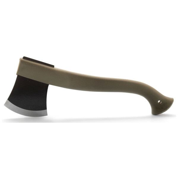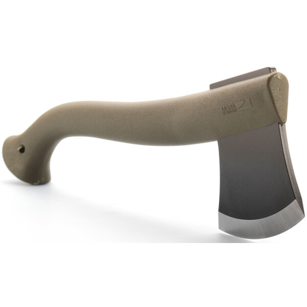 Представленный топор, Mora Camping Axe, очень компактен: его общая длина составляет немногим более 32 см, а протяженность режущей части лезвия – лишь чуть-чуть не дотягивает до 12 см. Несмотря на такие скромные размеры, топор без особого труда справляется и с толстыми ветками, и с небольшими кругляками. Полотно топора изготовлено из нержавеющей стали и покрыто слоем бора, нанесенным путем электрического напыления, который обеспечивает хорошую антикоррозийную стойкость. Рукоять топора или топорище, изготовленное из пластика темно-зеленого цвета, имеет оригинальный дизайн, изюминкой которого является наличие в его хвостовой части специального загиба, способствующего надежному удерживанию инструмента в руке и гашению отдачи при рубке.