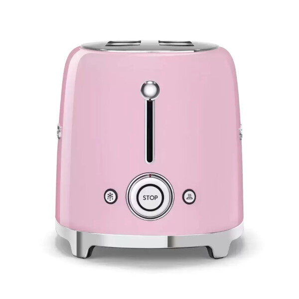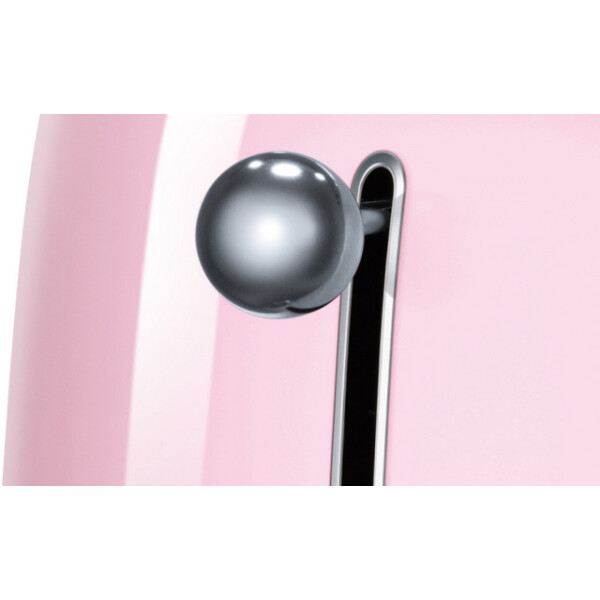 Тостер Smeg TSF01PKEU из серии «Стиль 50-х». На круглой ручке расположена шкала поджаривания. Вращая ручку, можно выбрать одну из 6 степеней поджаривания тостов. Если результат покажется неудовлетворительным, можно продолжить цикл поджаривания с помощью функции подогрева. Когда необходимо отменить или прервать цикл поджаривания, можно нажать кнопку «Стоп» в центре ручки. Функция размораживания предназначена для поджаривания замороженных тостов.