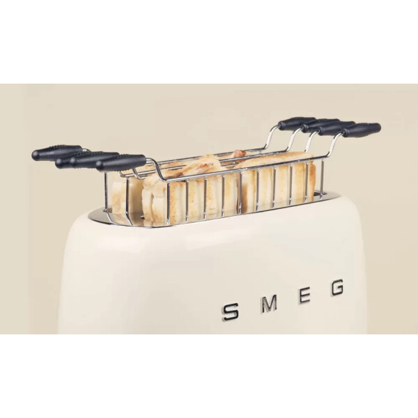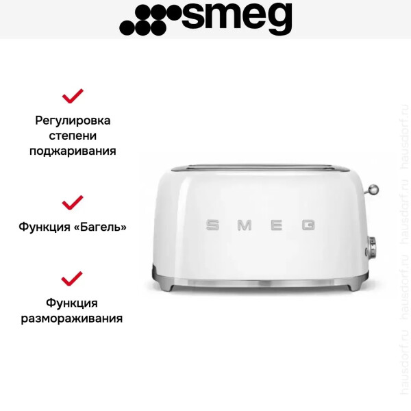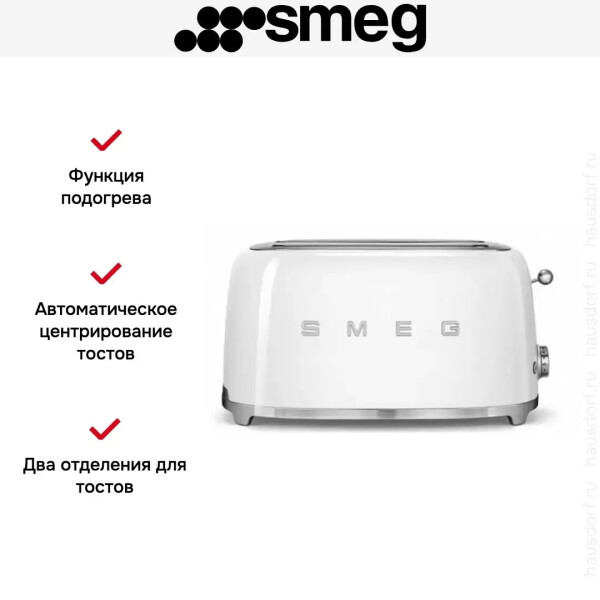 Smeg TSF02WHEU — стильный тостер в белом исполнении. Модель предусматривает наличие четырех отделений для тостов и поддерживает систему автоматической центровки ломтиков. Корпус из нержавеющей стали с эмалевым покрытием дополнен нескользящими ножками для безопасного размещения прибора.