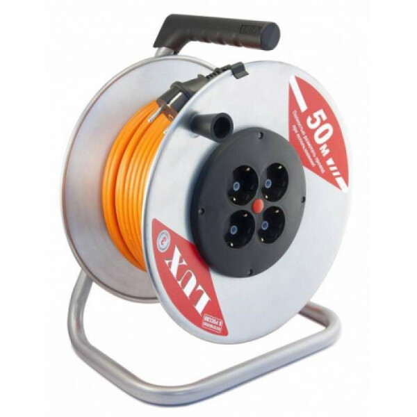 Силовой удлинитель на металлической катушке LUX К4-Е-50 50м 4 розетки с з/к 40150 4606400419433 предназначен для удаленной работы с электрическими приборами. Состоит из провода ПВС 3х1.5 длиной 50 метров, который размещен на металлической катушке. Для подключения приборов устройство обладает четырьмя гнездами. Заземляющий кабель обеспечивает безопасность использования. Ручка для переноски и удержания удлинителя выполнена из пластиката.