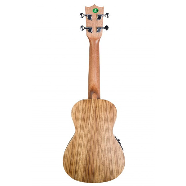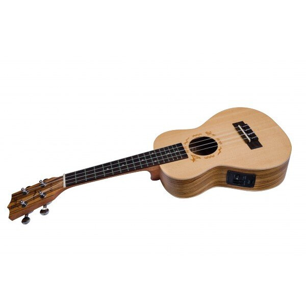 Укулеле-концерт Flight DUC 525 CEQ SP/ZEB. Её верхняя дека - из массива ели (благодаря чему звук инструмента сильнее и глубже, чем у инструментов с ламинированной декой), а её корпус из удивительно красивой породы дерева - зебрано.