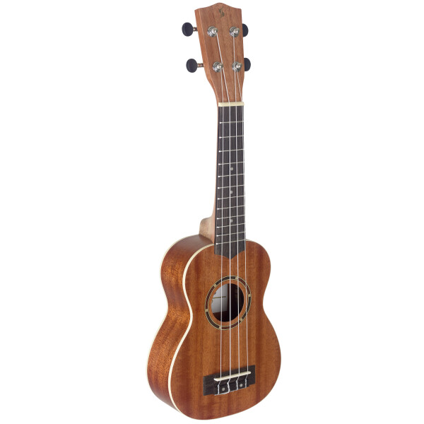 Stagg US-30 – традиционная четырехструнная сопрано укулеле, выполненная в классической натуральной отделке. Инструмент отличается невысокой ценой и простыми материалами, использованными в отделке. Верхняя, нижняя дека и обечайки – все выполнены из древесины сапеле, гриф сделан из красного дерева. Накладка на гриф – композитный материал, основой которого является синтетический орех. Также на накладке присутствуют белые маркеры, выполненные из ABS. Из особенностей инструмента нужно отметить комплектный чехол из черного нейлона с логотипом Stagg. Длина мензуры Stagg US-30 составляет 349 мм (13.7”). Бридж выполнен из того же композитного орехового материала, что и накладка на гриф. Общая длина укулеле – 534 мм (21”). Колки сделаны из металлических штифтов с черными лепестками. Используются струны Aquila. Вокруг розетки нанесена простая графика в виде круга с маркерами.