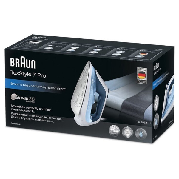 Основной цвет конструкции голубой, присутствуют белые элементы. BRAUN SI7062BL отличается высокой мощностью, данный параметр составляет 2400 Вт. Он прекрасно работает в различных режимах.