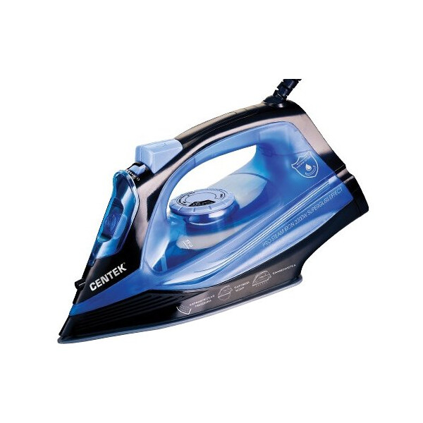 Утюг Centek CT-2351 BLUE с керамической подошвой, мощностью 2200 Вт. В наличии функции распыления, самоочистки и мощного парового удара. Производителем также предусмотрены защита от накипи и защита от протекания воды. Преимуществом утюга является наличие возможности вертикального отпаривания. В модели реализован яркий LED-индикатор. Емкость резервуара для воды равна 300 мл. Сетевой шнур имеет длину 1.5 м.