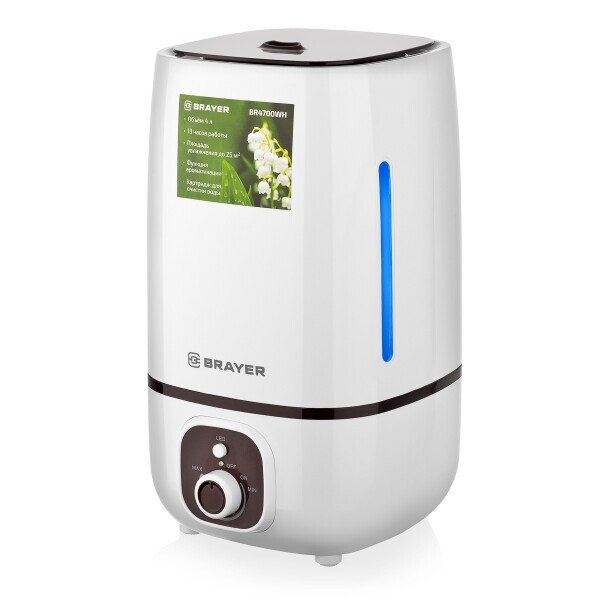 Увлажнитель воздуха Brayer BR4700 представлен в компактном настольном дизайне с зеленым корпусом. Мощности данного прибора хватает для обслуживания территории 25 м. Устройство в течение 13-ти часов может работать непрерывно, после чего автоматически отключается. Вы легко разберетесь в механическом управлении, а также сможете настроить интенсивность испарения и направление увлажнения.