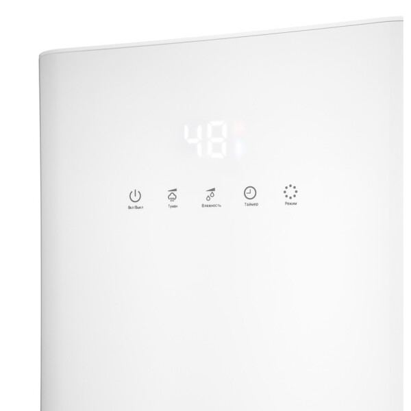 С помощью кнопок на передней панели можно установить целевую влажность воздуха 3090 % с шагом 5, время таймера от 1 до 12 часов и интенсивность тумана 1, 2 или 3.