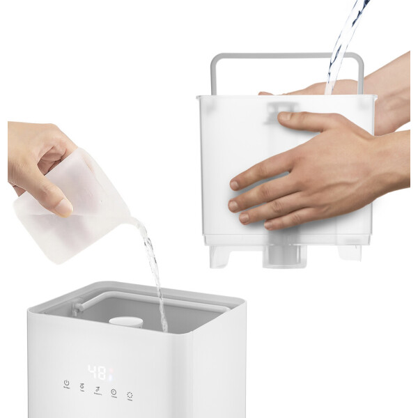 В основание корпуса встроен PTC-нагреватель, который нагревает воду примерно до 50 C, и из увлажнителя выходит тёплый туман. Он быстрее увлажняет воздух в помещении. В процессе нагревания воды погибают некоторые бактерии и микроорганизмы.