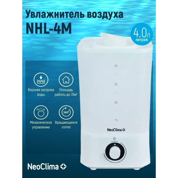 Увлажнитель воздуха ультразвуковой Neoclima NHL-4M это бытовой прибор, который предназначен для поддержания нормального уровня влажности в помещение и создает оптимальный микроклимат в квартире, на даче или офисе. 3 режима работы. Очень удобный верхний залив воды, а вращающееся сопло регулирует направление потока влажной струи. Бесшумный увлажнитель Neoclima NHL-4M незаменимый помощник в доме.